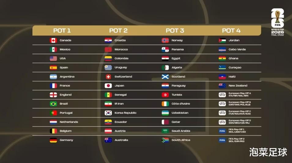 【第一档】美国(14位)、墨西哥(15位)、加拿大(27位)【以上均为东道主】、西班牙(1位)、阿根廷(2位)、法国(3位)、英格兰(4位)、巴西(5位)、葡萄牙(6位)、荷兰(7位)、比利时(8位)、德国(9位)