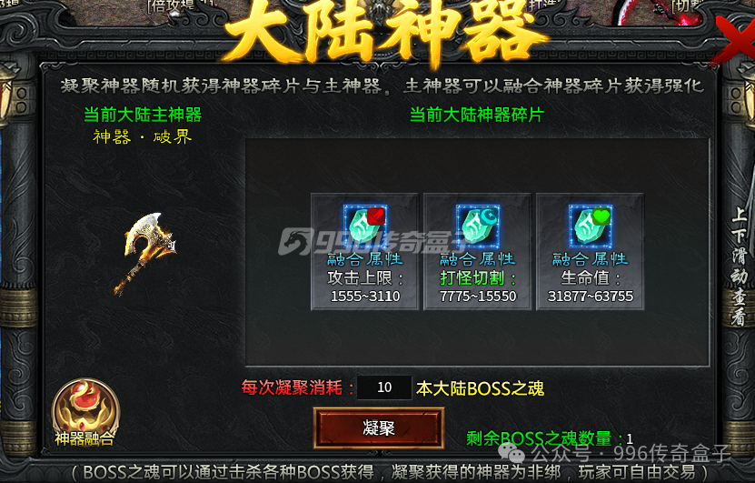 四大陆会有神器凝聚玩法,刷BOSS就行了,大陆BOSS也可以,地图中的红名BOSS也可以,击杀BOSS会获得BOSS之魂,十个BOSS之魂就能随机凝聚一个神器,有专属属性。这个玩法后续大陆也会有,相同的多余的神器可以进行融合。