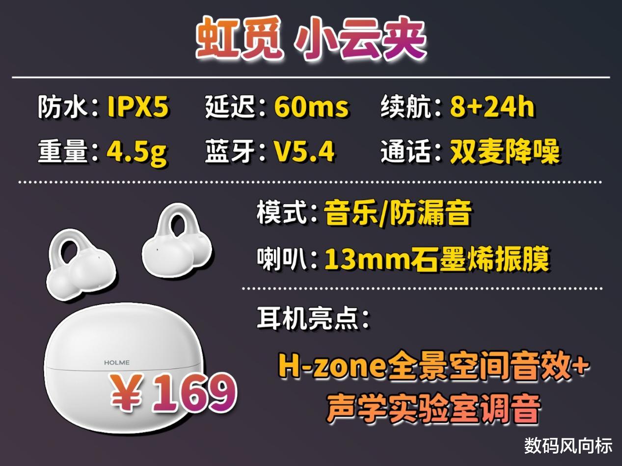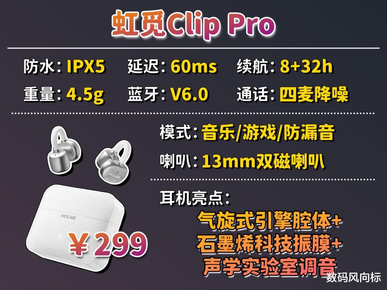 虹觅Clip Pro在音质上采用13mm双磁喇叭,使声音更扎实有力;气旋式引擎腔体能推动更多气流,显著增强低频的力度与弹性;石墨烯科技振膜韧性更强,确保人声与乐器细节清晰还原;再经由声学实验室专业调校,整体听感层次丰富且均衡。佩戴方面运用了错位设计与弧面耳托,加上4.5克机身佩戴轻盈贴合。性能上支持防漏音模式、智能一拖二连接,清晰的四麦通话降噪让通话更清晰,综合续航满足全天使用。虽然缺少手机APP,但它全面的功能还是很值得选择。