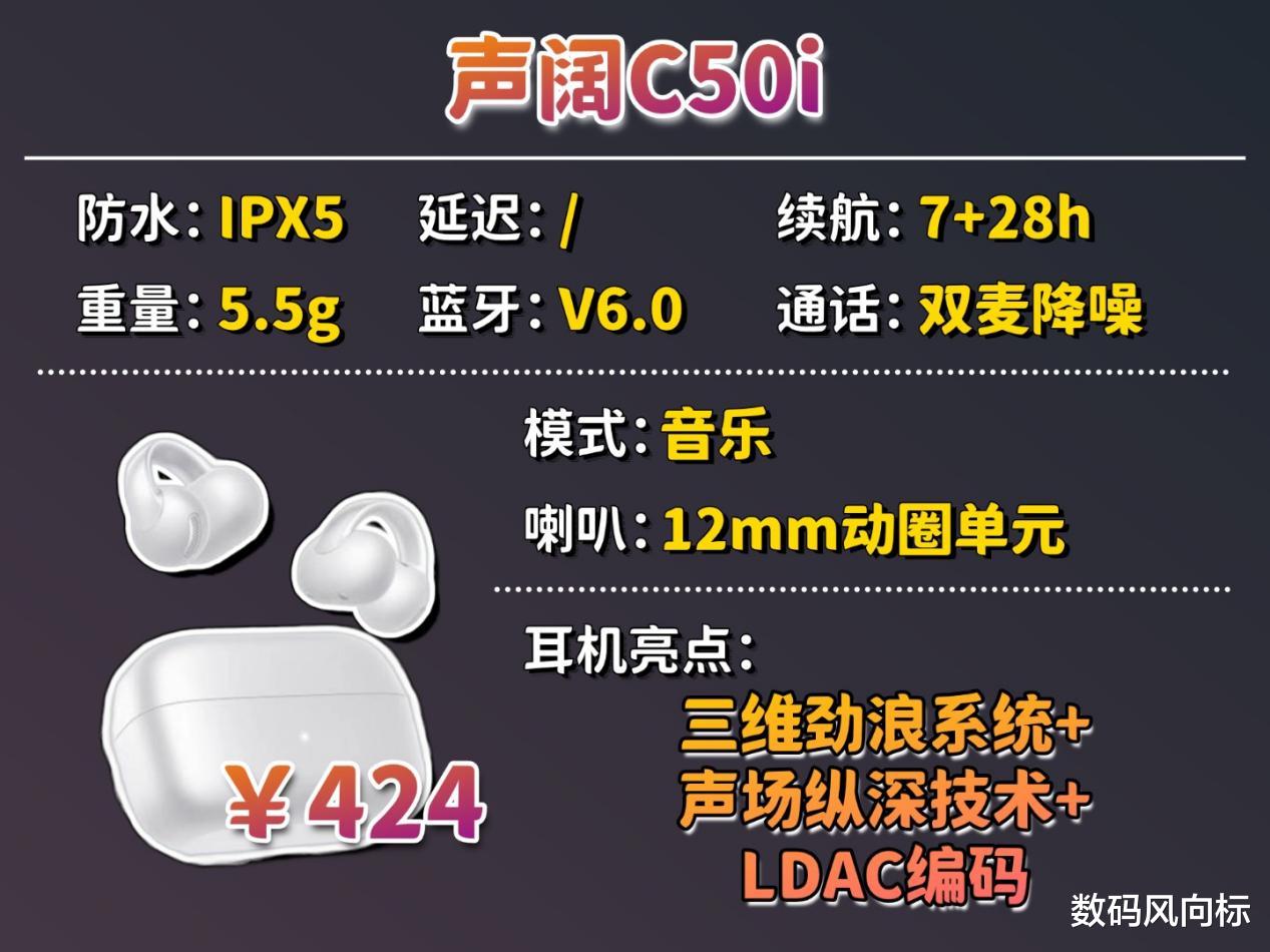 声阔C50i在音质上采用12mm动圈单元,提供扎实的中低频基础;三维声学系统增强了声音的立体感与氛围;声场纵深优化技术进一步拓展了听音空间;同时支持LDAC高清编码,能保留更多音乐细节,整体听感饱满且富有层次。佩戴上采用柔性力学架构与人体工学设计,5.5克机身贴合稳固,但舒适性一般,长时间使用耳部易有压迫感。性能上具备通话降噪与IPX5级防水,续航可满足全天使用。虽然性价比与佩戴舒适度有提升空间,但扎实的音质表现仍然很值得推荐。