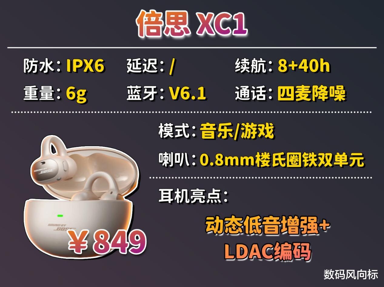 倍思 XC1在音质上采用0.8mm楼氏圈铁双单元,结合了动圈的饱满与动铁的清晰,解析力出色;SuperBass 3.0技术能动态增强低频,让鼓点更有力;同时支持LDAC高清编码,能保留丰富的音乐细节,人声通透。佩戴上采用云朵气囊与镍钛合金丝,触感柔软且分散压力,长时间舒适,但稳固性一般。性能上具备四麦通话降噪,通话清晰;支持IPX6防水与40小时总续航,性能表现优秀。它是一款音质出色、佩戴舒适且续航强的耳机,虽然稳固性有提升空间,但其综合体验依然值得考虑。
