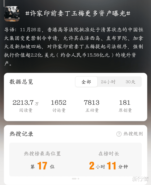随后,许家印前妻丁玉梅更多资产曝光的消息便冲上了热搜,引发网友热议。