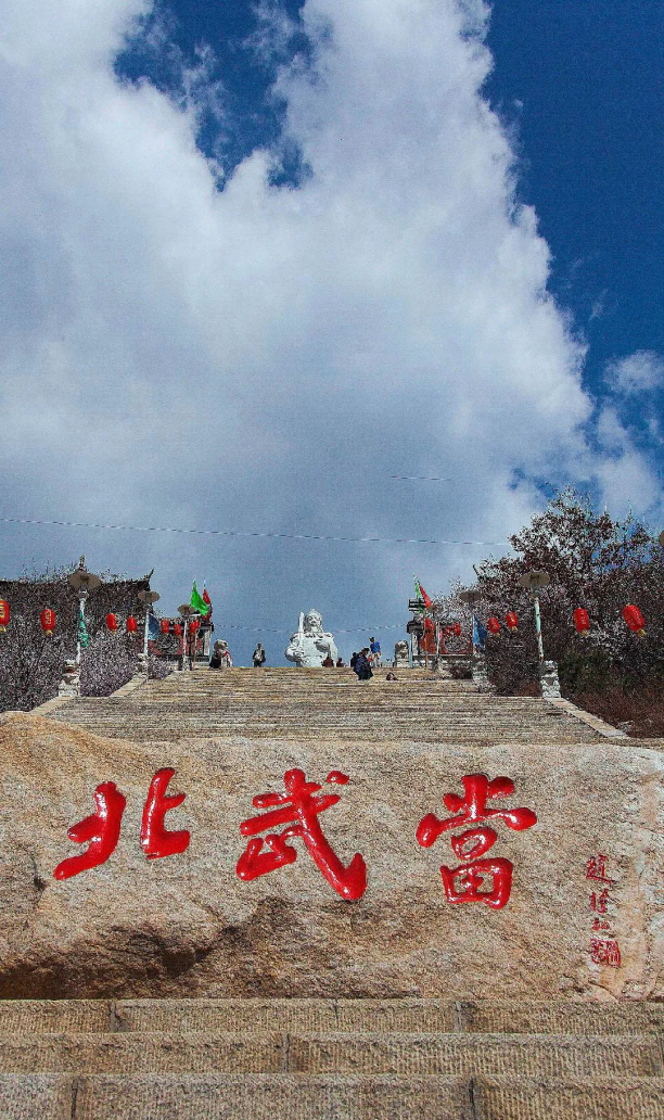 驱车驶入景区,青山相对,红黄相间的枫叶如云霞朵朵,台阶路两侧的松柏四季常青,景色如诗如画,指引着游人向山顶进发。