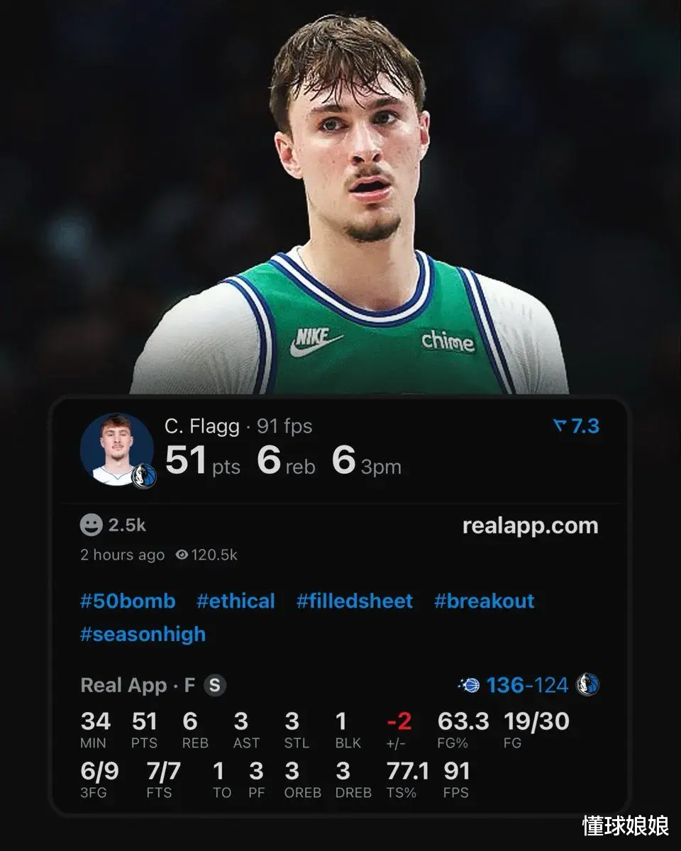 但是!!但是!!独行侠出息了,基德说他们有新的未来核心,让媒体把东契奇那事翻篇,原来是真的有了呀。弗拉格打了34分钟,30投19中,3分球9投6中,拿到了51分6板3助。NBA全新的最年轻50分先生出炉了!!!