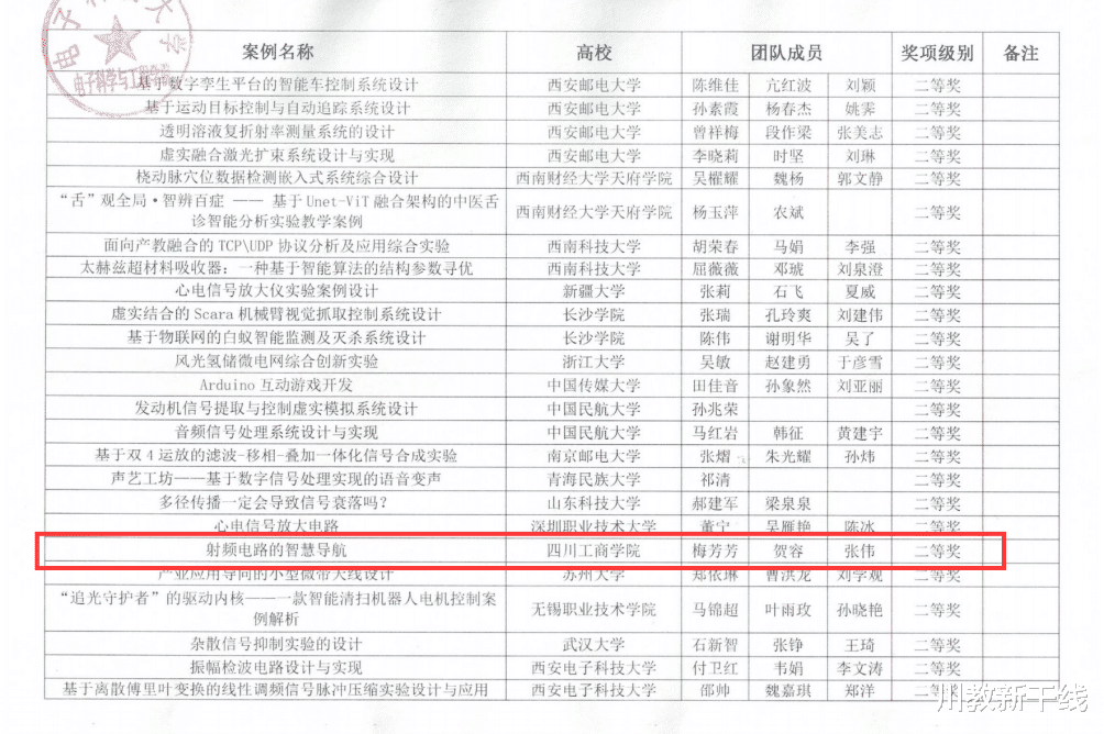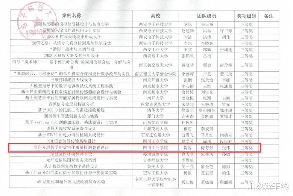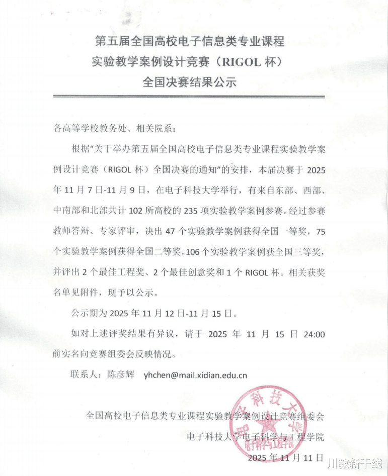 近日,由教育部高等学校电子信息类专业教学指导委员会、国家级实验教学示范中心联席会电子学科组和中国电子教育学会联合主办的第五届全国高校电子信息类专业课程实验教学案例设计竞赛(RIGOL杯)全国总决赛在电子科技大学圆满落幕。本次竞赛汇聚了全国四大赛区的优秀教师同台竞技,旨在推动探究性、创新性实验教学改革,提升教师实践教学水平。经过激烈角逐,四川工商学院教师团队表现优异,凭借卓越的教学设计能力,最终斩获全国二等奖一项、三等奖一项,展现了学校在跨学科实验教学领域的创新活力与扎实功底。