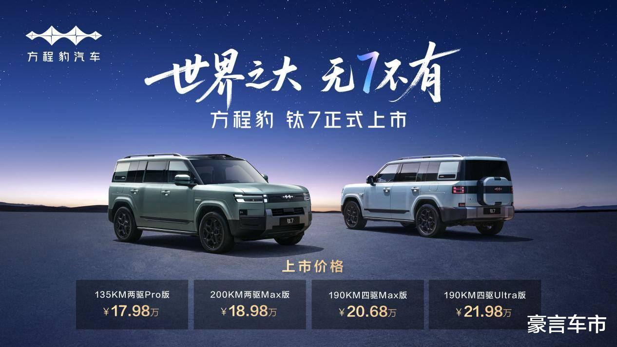 10月14日,“方程豹钛7媒体动态品鉴会暨交付仪式”活动在石家庄滹沱河露营场地举办,众多区域媒体及钛7车主齐聚现场,共同见证“科技大空间SUV”钛7的区域亮相。新车推出135KM两驱Pro版、200KM两驱Max版、190KM四驱Max版、190KM四驱Ultra版等4款配置,价格区间17.98万元-21.98万元,以硬派基因与全能实力重塑都市家庭出行新标杆。