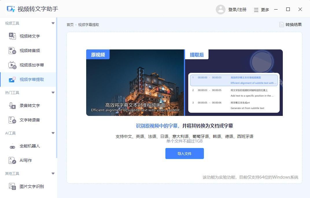 这是一款专门进行视频编辑与转换的多功能工具,首先我们需要的视频字幕提取功能对它来说就像家常菜一样简单。只需要点开“视频字幕提取”功能,再把视频导入进去,它就可以快速扫描并显示字幕文字出来,我们可以挑选自己所需要的部分再让该工具进行导出,非常方便。