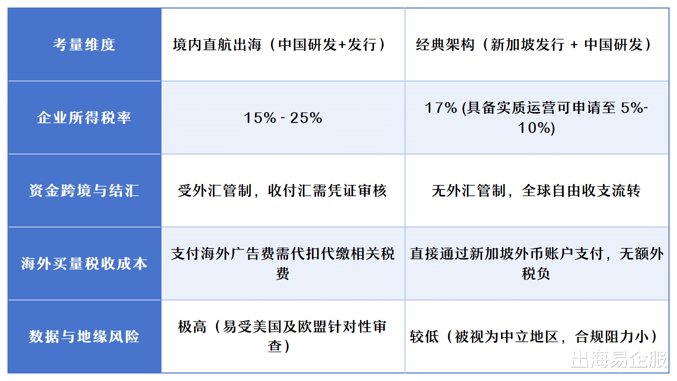 规避境内外汇监管繁琐流程: 若使用中国境内主体直接收取海外游戏流水,需面临复杂的外汇结汇申报、服务贸易外汇管理等流程,且向海外支付巨额广告费时,需代扣代缴约 6% 的增值税及附加,甚至可能涉及预提所得税。新加坡架构彻底打通了海外资金内部循环的闭环!