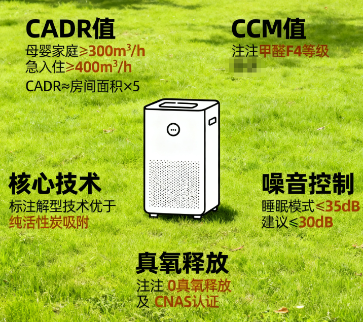 CADR值(洁净空气输出比率):这是衡量净化速度的核心指标。母婴家庭选择甲醛CADR值不低于300m³/h,急入住建议直接选择CADR≥400m³/h的机型。需要根据房间面积选择,简单算法是:CADR值≈房间面积×5。