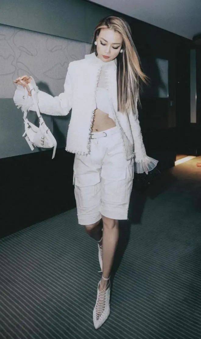 出席时装周当天,容祖儿发布了酒店出发图,一身白色套装相当时尚。上身是一件白色小香风无扣外套,领口设计得十分华丽,内搭则是一件半透明蕾丝抹胸上衣,大方露出腹肌马甲线,锁骨隐约看见,外长内短的搭配看起来相得益彰,显得相当性感火辣。