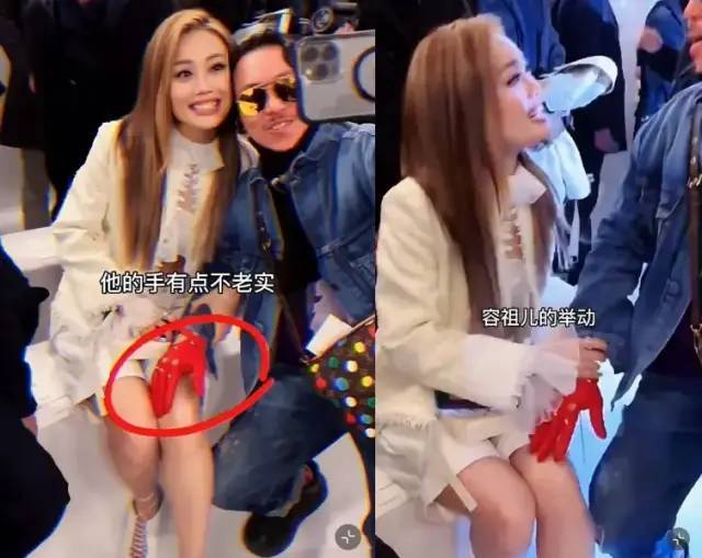 然而,男子戴着红色破洞手套的右手却是相当不老实,直接摸到了容祖儿的大腿上。画面中,该男子似乎想趁着合照的契机让容祖儿分心,顺势摸进内侧,不过容祖儿十分警觉,紧紧夹住膝盖,同时牢牢地用左手按住了男子的手腕,阻止了男子继续往下伸的东西,然后转身再用右手握住男子的手,一方面是防止对方这手再乱摸,另一方面,也当是两人之前的亲密握手,既给足了对方面子,也避免自己再被骚扰。