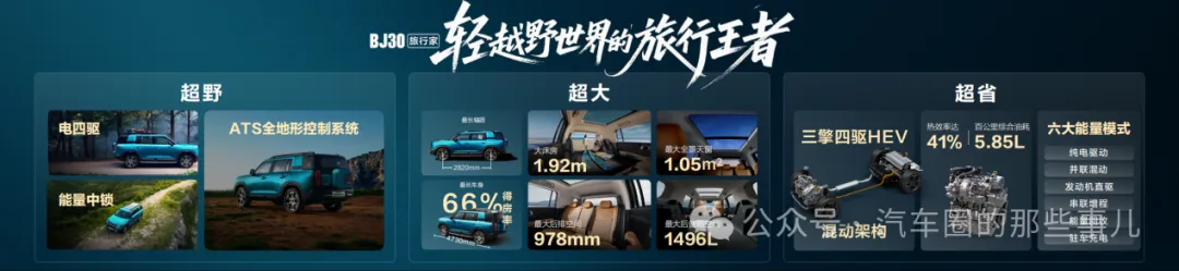 即便是轻越野旅行SUV,也需要足够专业的越野能力。BJ30旅行家要做越野能力最强的轻越野旅行SUV,搭载超级混动系统,拥有同级最大的301kW综合功率和同级最大的685N·m综合扭矩;搭载电四驱系统,响应速度仅需0.03秒,是机械四驱的3倍以上;搭载极速模式,零百加速仅需6.59秒;配备“能量中锁”和“四轮电子限滑”功能,能自动识别打滑车轮并将动力瞬间转移至有附着力的车轮,实现轻松脱困;拥有ATS全地形控制系统,提供雪地、沙地、泥地、涉水等7种驾驶模式,应对旅行之中的复杂路况。BJ30旅行家通过更高维度的技术标准来打破轻越野市场。可以说,这是对行业现有产品的“降维打击”。