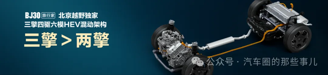 三擎混动,节能宗师!BJ30旅行家要做最省的轻越野旅行SUV,采用北京越野独家研发的“三擎四驱六模HEV混动架构”,百公里综合油耗低至5.85L,具备纯电、串联、并联、直驱、能量回收、驻车充电六大动力模式,系统会根据车速、路况、油门深度等参数,在各种模式间智能切换;搭载混动专用发动机,是保时捷同款黑科技,热效率高达41%。