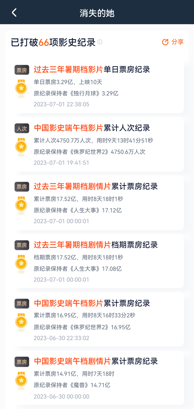 数据显示:《消失的她》自6月22日上映以来,已经相继打破了包括“中国影史端午档剧情片累计票房纪录”、“过去三年暑期档剧情片累计票房纪录”在内的66项影史纪录,这成绩一路绝尘。