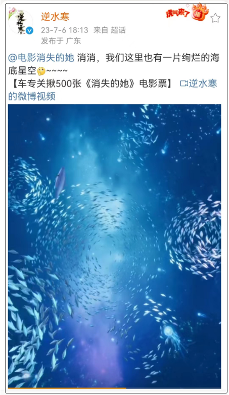 像网易最会营销的国风游戏《逆水寒》,最近就艾特电影《消失的她》官博,称:“我们这里也有一片绚烂的海底星空,一起来看!”