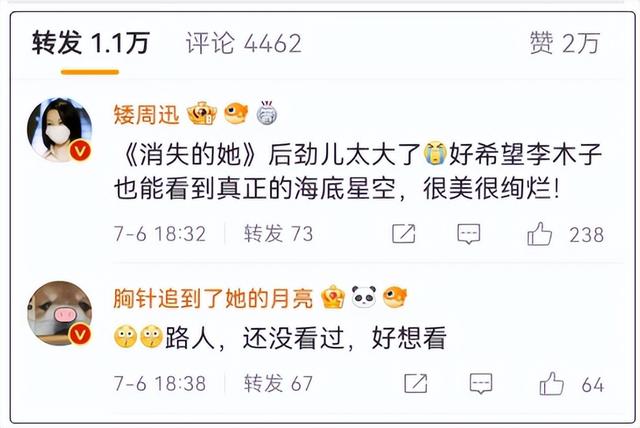 就连王宝强的《八角笼中》和吴京的《巨齿鲨2》都和《消失的她》来了个神奇的联动,特别是《巨齿鲨2》,网友热议既然吴京演的九溟(jiu ming)也在深海,能不能救救隔壁可怜的李木子,她在深海喊救命啊啊。