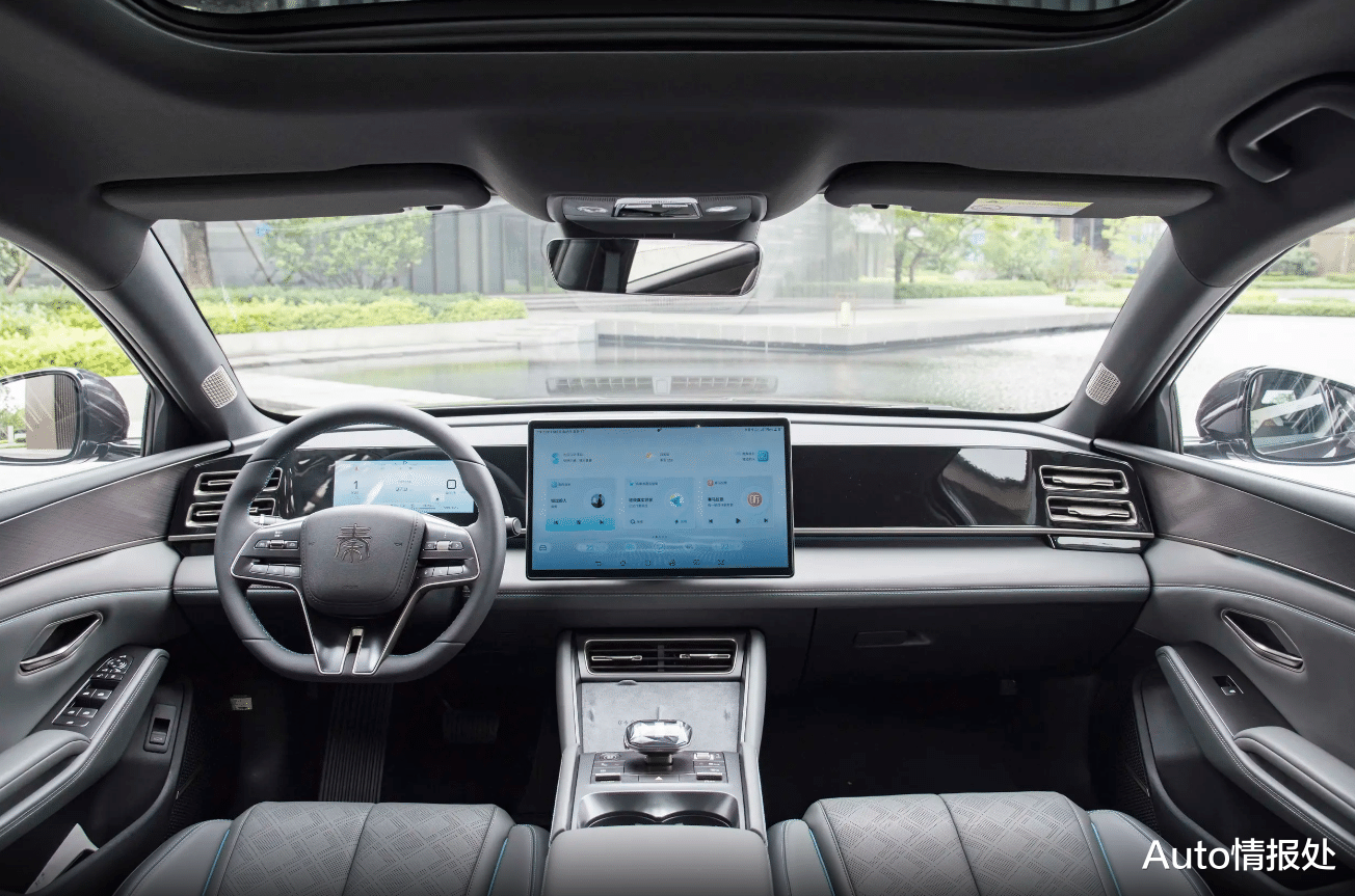 比亚迪秦L DM内饰有着不错的氛围感和质感,中控台的布局简约,规整,并且增加了钢琴烤漆面板,全液晶仪表的尺寸为8.8英寸,中控屏幕的尺寸为10.1英寸,12.8英寸,15.6英寸,换挡机构采用电子式。