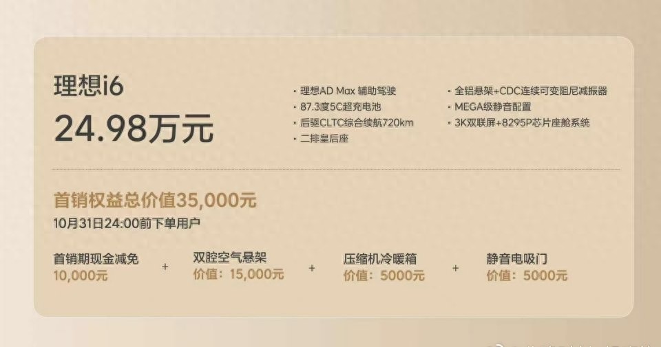 理想i6上市售价赶在周末前(9月26日)正式公布,新车共发布两个版本,售价分别为24.98万/26.98万元,上市权益包含1万元的现金优惠,因此实际的起售价为23.98万元,另外还赠送双腔空气悬架、冰箱和静音电吸门,配置给的很高。
