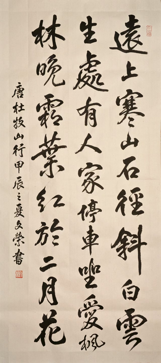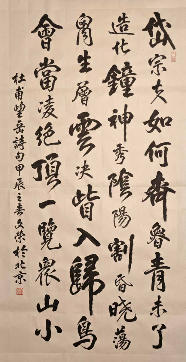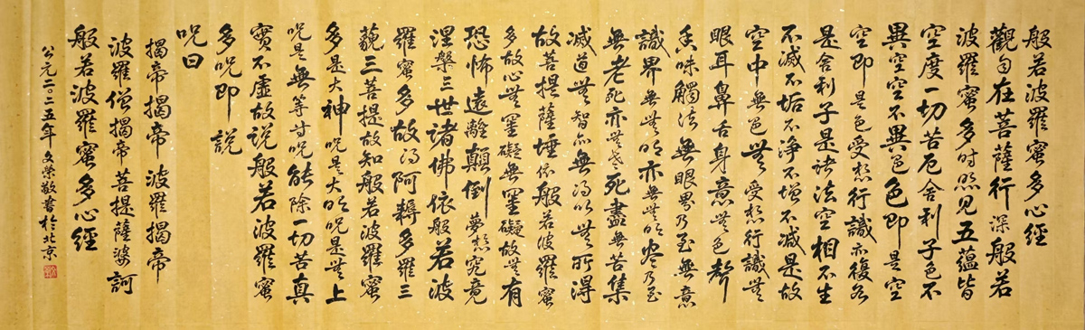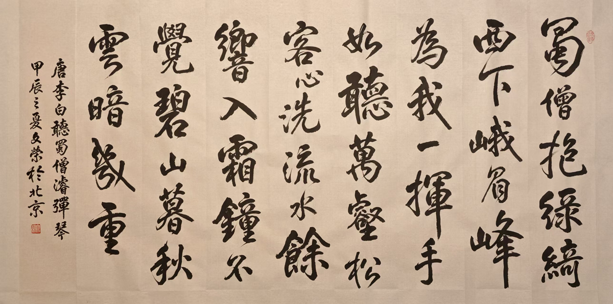 菲菲老师之书法,如行云流水,既有《心经》之庄严宁静,又含杜甫诗句之豪迈壮阔。字字如珠落玉盘,既有女性的柔美,又不失骨力与韵律,恰似清风拂面,又似古琴轻弹,引人入胜,耐人寻味。每一笔,每一划,都是心灵的低语,是对古典美学的深刻领悟与现代情感的巧妙融合。