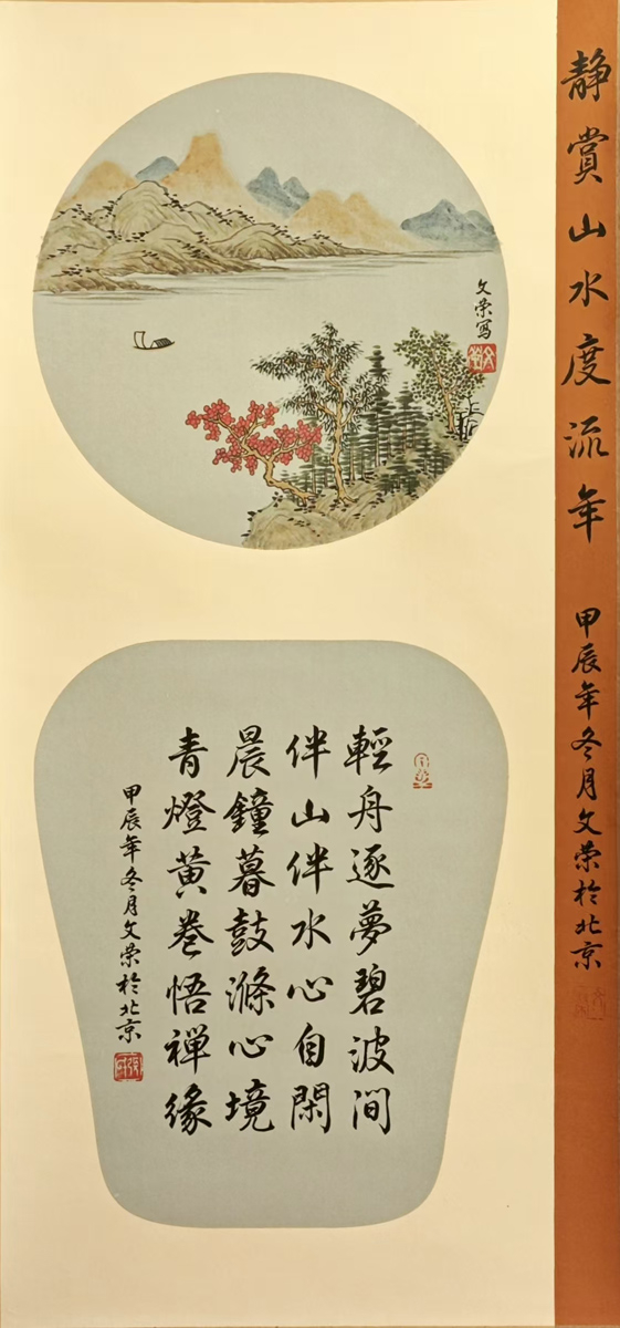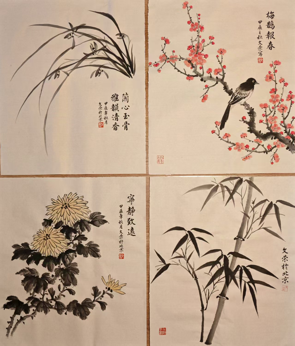 而其绘画,则是诗意的栖居,是心灵的逃逸。梅兰竹菊,四君子在其笔下栩栩如生,或傲雪凌霜,或清雅脱俗,或坚韧不拔,或淡泊名利,皆成佳话。梅花之“众芳摇落独暄妍”,于寒风中绽放坚韧与高雅;菊画旁的茶具静置,透出一份“品茗悟道满室馨”的闲适与淡然。更有那山水小品,轻舟碧波,晨钟暮鼓,仿佛能听见山间梵音,看见云溪风轻,让人心随画游,忘却尘嚣。