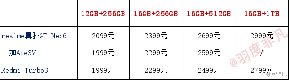 首先从价格层面来说,realme真我GT Neo6的各个版本都比一加Ace3V贵了100元,但同为OPPO阵营的子品牌,realme真我的竞争目标确实不是一加,而是Redmi Turbo3,所以我们也看到realme真我GT Neo6增加了16GB+1TB的版本,这个内存组合方案是一加Ace3V没有的,但Redmi Turbo3是有的。