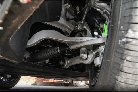 底盘及操控表现同样亮点颇丰。零跑C11配备了前双叉臂独立悬架与后五连杆独立悬架的组合,且全系标配可变悬架系统,能够根据路况和个人驾驶习惯灵活调整悬架的刚柔硬度,兼顾舒适与操控需求。在试驾过程中我们感受到,面对城市道路上的小范围颠簸时,悬架初段的调校略显偏硬,保证整车的良好支撑性;而通过桥接缝隙等细碎震动时,车内回馈细微,车身依旧姿态稳健,没有明显晃动;当遇到较大坑洼时,悬架能迅速且有效地吸纳冲击,保障乘坐舒适。整个悬架调校风格偏欧洲豪华车的稳重韧性,表现出细致的调校工艺。制造工艺方面,多处悬挂连接杆及关键部件采用铝合金材料,以减少簧下质量,提升操控灵敏度;摆臂、转向节等重点零部件也经过轻量化设计,进一步减轻整备质量,提高操控响应速度及燃油经济性。