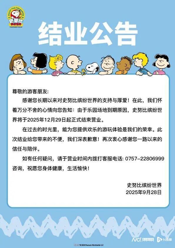 运营时长尚不足十年,曾怀揣 “全球最大” 梦想的史努比主题公园,即将与游客告别。9 月 28 日,位于广东佛山市顺德区大良街道的史努比缤纷世界,正式对外发布《结业公告》,明确因乐园场地租赁期限到期,将于 2025 年 12 月 29 日起彻底停止营业。记者致电乐园客服进一步咨询,工作人员表示,目前内部尚未收到任何关于另行选址、重建开业的通知,这意味着陪伴不少市民成长的 “史努比乐园”,将正式退出历史舞台。