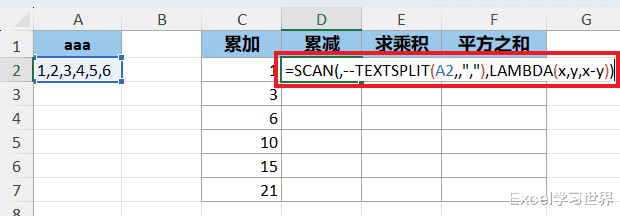 与前一个公式不同之处在于将 scan 函数的最后一个参数改成了 LAMBDA(x,y,x-y),这是因为 Excel 中并没有现成的减法函数,因此用 lambda 执行递归相减,用累加器的值减去当前元素;