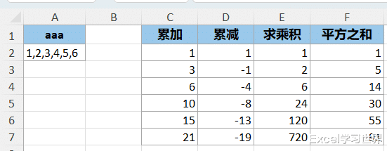 D2 单元格的值为第一个元素的值 1,它是累加器的起始值;