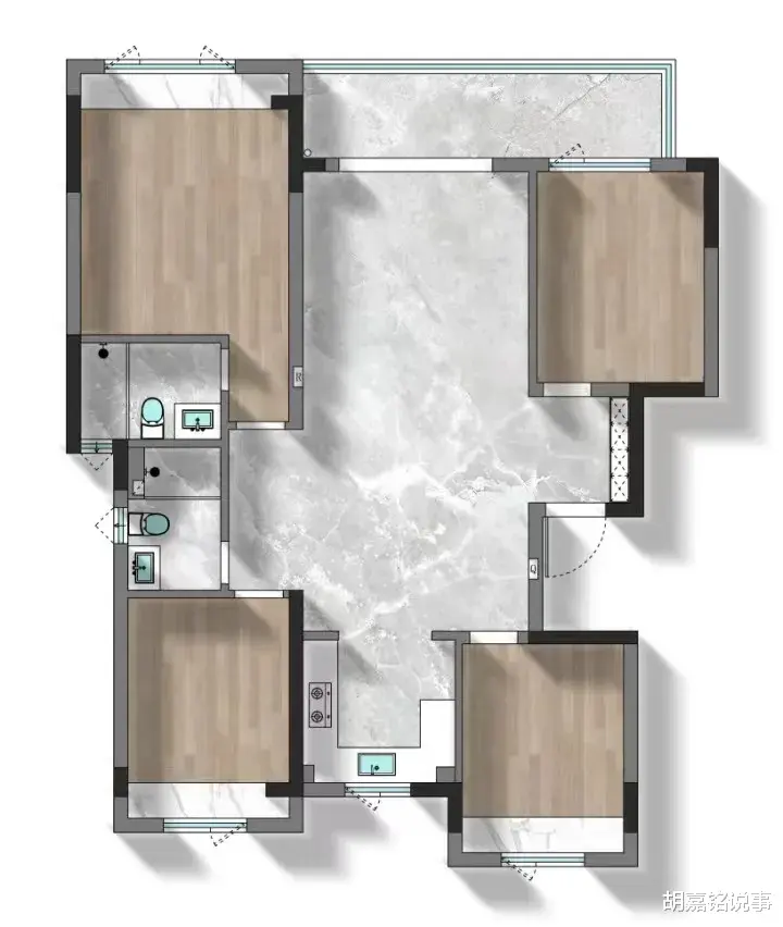 ✅想要墙面整体性更好,就选隐形门。✅想要美观度更高,则可以根据风格选择双开门、拱形门等等。2、优化动线攻略很多四叶草户型,卧室是分布四个角落了,但卫生间却只处于一侧,这就导致处于另一侧的卧室去卫浴的动线过长,白天还好,起夜才是痛苦。