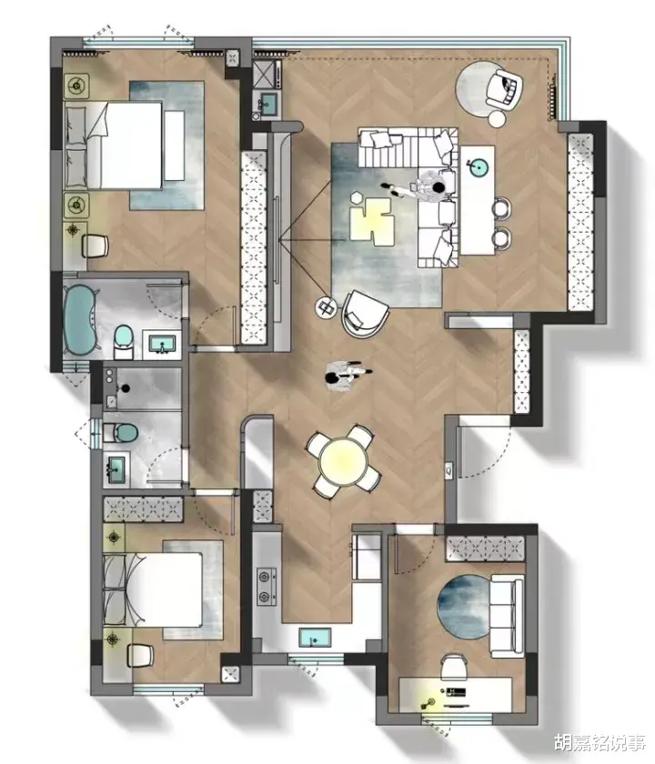 以客餐厨为中心活动区,四个卧室分别处于空间的四个角,让房屋的居住者之间互不打扰。今天,飞墨君就来说说四叶草户型的设计布局攻略~01四叶草户型如何布局设计拥有四个卧室,居住也拥有多种可能性,设计装修,我们先从户型布局开始说起。1、不改户型布局在不改户型的情况下,四个卧室我们可以有多种规划。