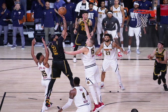 洛杉矶湖人安东尼戴维斯之间的丹佛掘金PJ多齐尔,左,和尼古拉乔基奇(15)在第二场比赛中,他们的联盟会议最后季后赛篮球比赛9月9日。2020年20日,佛罗里达州布埃纳维斯塔湖。安东尼·戴维斯在比赛时间结束时投进3分,帮助湖人2分取胜。第三场比赛在周二晚上进行。佛罗里达州布埃纳维斯塔湖:安东尼·戴维斯在周日晚上的比赛中投进了一个3分,帮助洛杉矶湖人以105-103战胜丹佛掘金,并在西部决赛中以2-0领先。戴维斯以31分结束比赛。他拿下了洛杉矶最后10分,下半场拿下22分,帮助湖人避免成为丹佛卷土重来的最新受害者。掘金已经落后了16分,但是尼古拉·约基奇在比赛还剩20秒的时候连续拿下11分,包括一个篮筐,使丹佛以103-102领先。