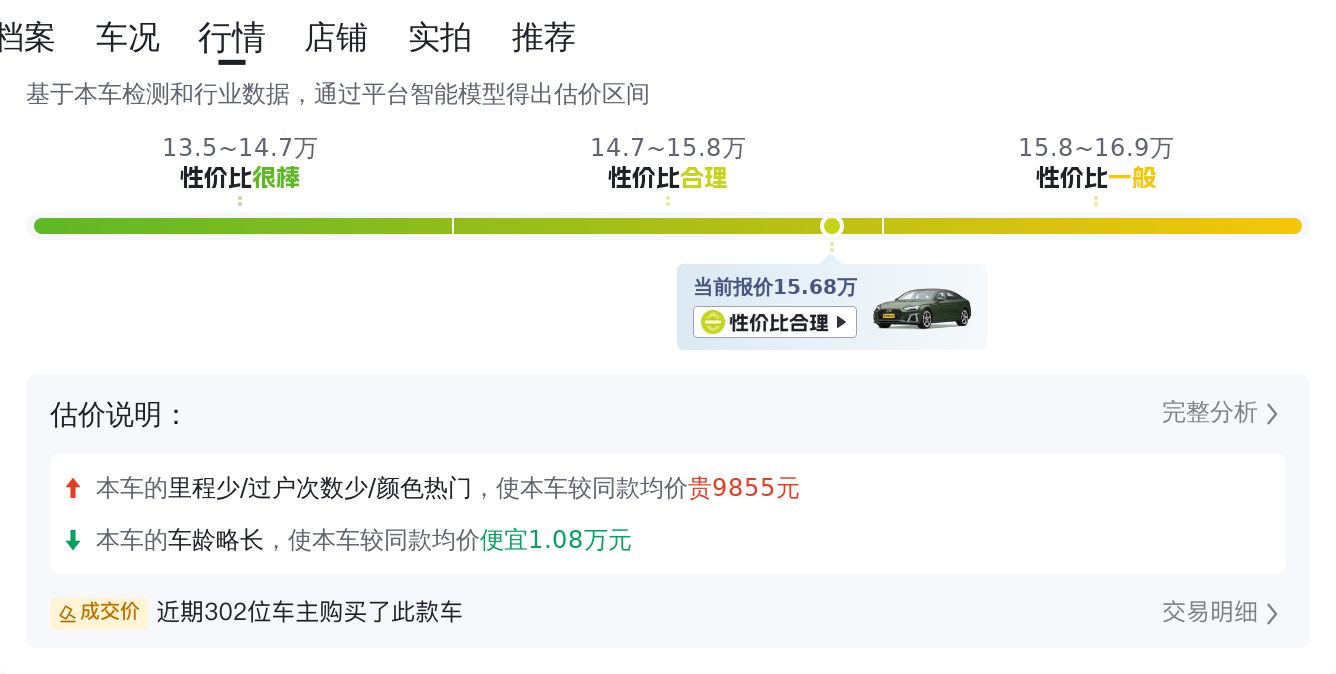 根据我们对市场的了解,目前这款二手奥迪A5的市场行情大致在16.03万元至19.16万元之间。这里值得一提的是,市场行情价和最终成交价是有差异的,车辆的最终售价会由车龄、里程、车况等不同变量决定。