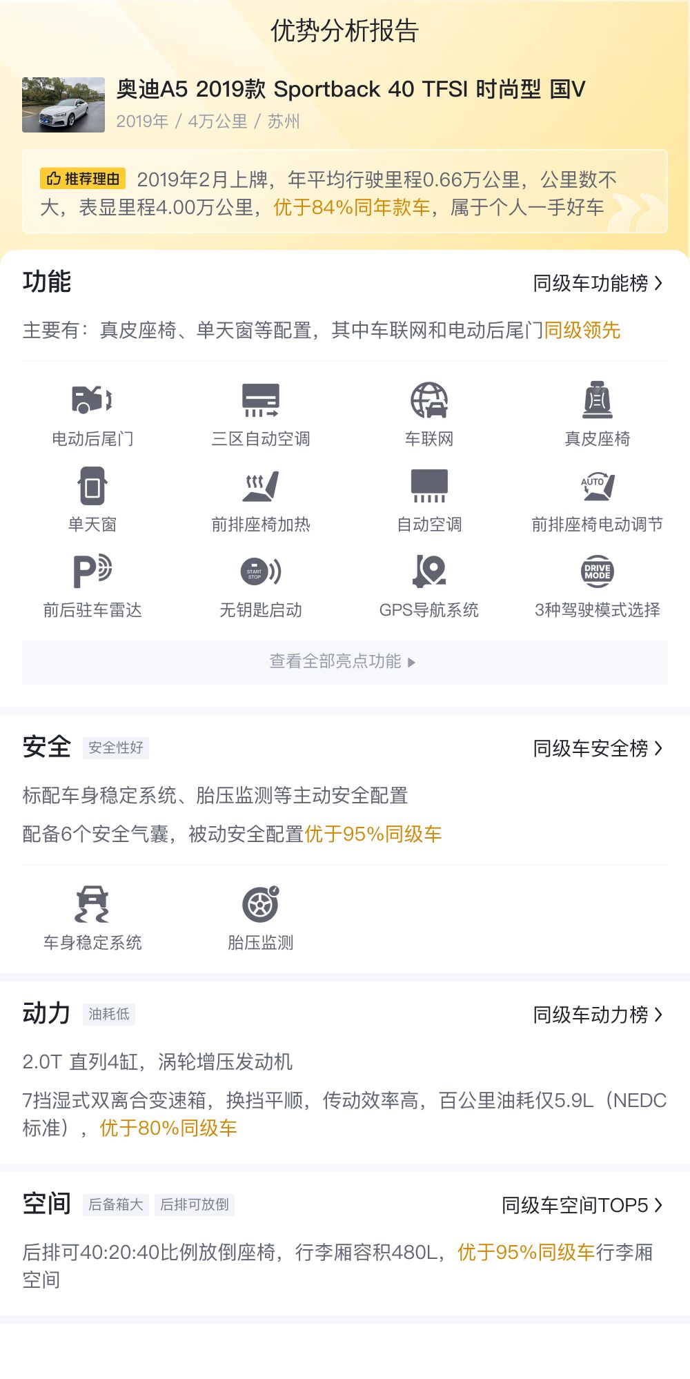 这辆2019款奥迪A5 Sportback 40 TFSI 时尚型 国V,外观为白色,于2019年2月在江苏苏州上的牌照,至今行驶了4万公里,未过户。这辆车的新车指导价为37.18万元,目前二手车报价15.68万元。