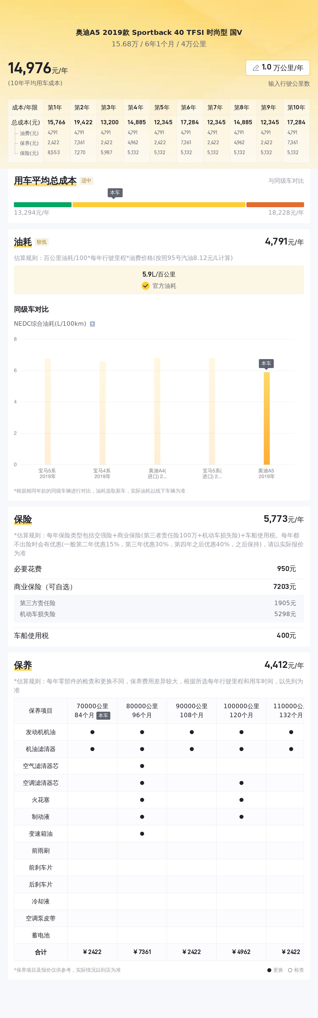 在用车成本部分,根据估算,这辆车的年均综合用车成本约1.5万元左右。这项花销是跟车主的实际用车场景和使用强度有直接变化的。