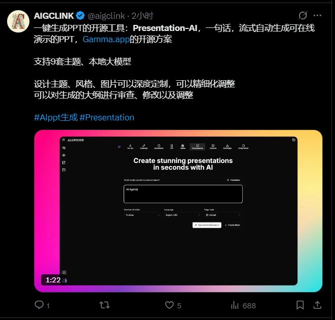 开源利器,打破专业表达门槛小编觉得,Presentation-AI的真正价值在于把PPT从“设计负担”还原成了“思想载体”。当制作时间从数小时缩短到几分钟,而且还不需要设计技能,专业表达的门槛就被彻底打破了。