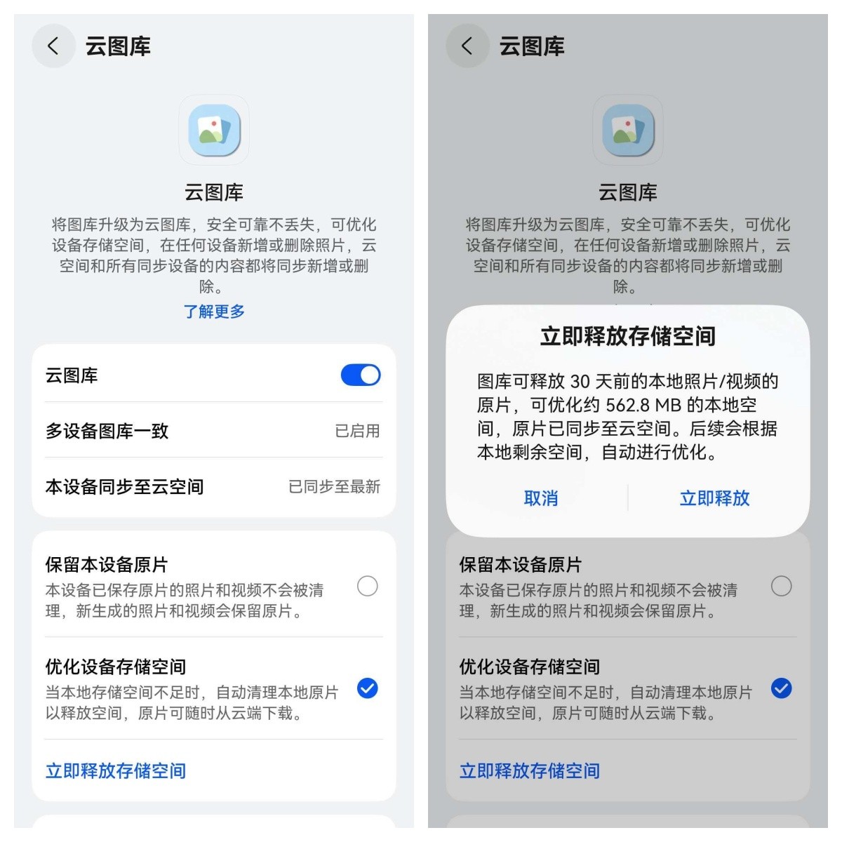 首先必须吹爆的,就是“云图库”功能。我之前最大的痛点就是相册里的照片和视频太多,即使每次换机都买更大容量的版本,但手机存储空间依然捉襟见肘,删照片又是一个过于庞大的工程,想想都累,动手更是不可能……而开启了云图库里的“优化设备存储空间”选项后,手机里的高清原图、原视频就会自动安全保存到云端,当手机空间紧张的时候,还会智能地把本地不常用的照片和视频会被替换为一个小尺寸版本,手机自动“瘦身”,随时保持充足本地空间。
