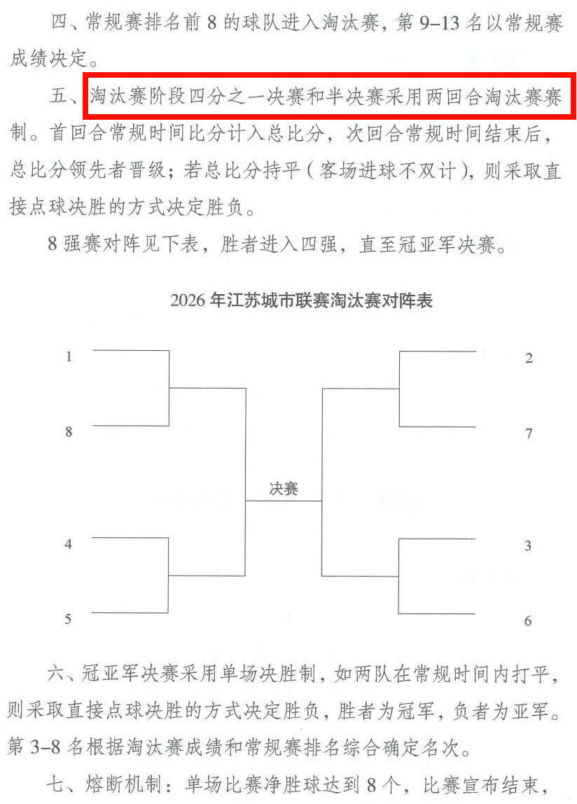 而据悉,2026年苏超将在淘汰赛1/4决赛(8进4)和半决赛(4进2)采用主客场两回合淘汰赛制。两回合常规时间总比分领先者晋级,如比分持平则采取直接点球方式决胜。而据悉,2026年苏超除了淘汰赛1/4决赛和半决赛,即小组赛和总决赛,仍将采取单回合赛事。2026小组赛的主客场将和2025对调,即比如2025苏超,盐城队客场对阵南通队,那2026苏超,盐城队将主场对阵南通队。