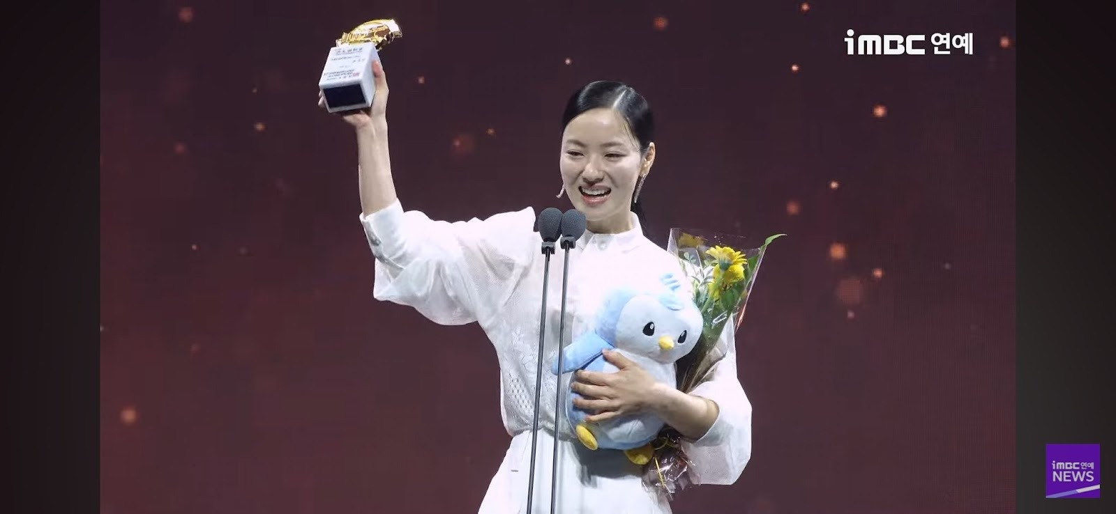 而这种文化融合,已经不只是停留在理论层面。就在最近,在第45届韩国黄金摄影奖——这个韩国电影界的重量级颁奖典礼上,戏剧性的一幕发生了:一位女演员在台上领奖和致辞时,手中除了捧着鲜花,还自然地拿着一只胖企鹅玩偶。