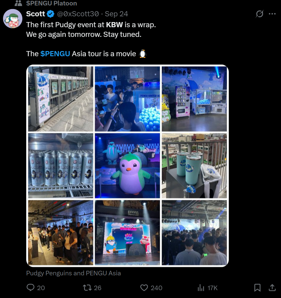 秋天,当全球加密世界的目光聚焦于首尔,韩国区块链周(KBW)的热浪点燃整个亚太市场的神经。这里是全球最活跃、也最独特的加密市场之一,贡献了全球近 10% 的交易量,任何风吹草动都可能酝酿成一场风暴。今年的 KBW 同样热闹非凡,但在一众技术叙事和 Alpha 项目中,一只胖企鹅的身影显得格外不同。