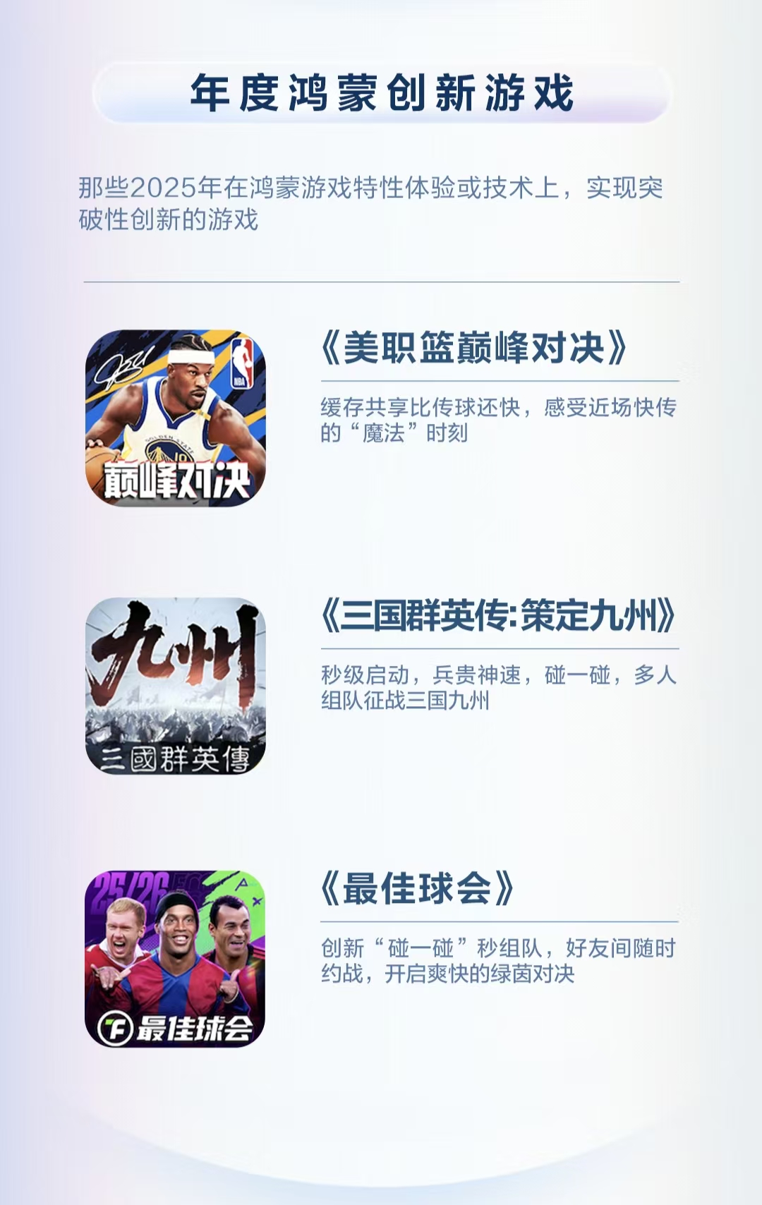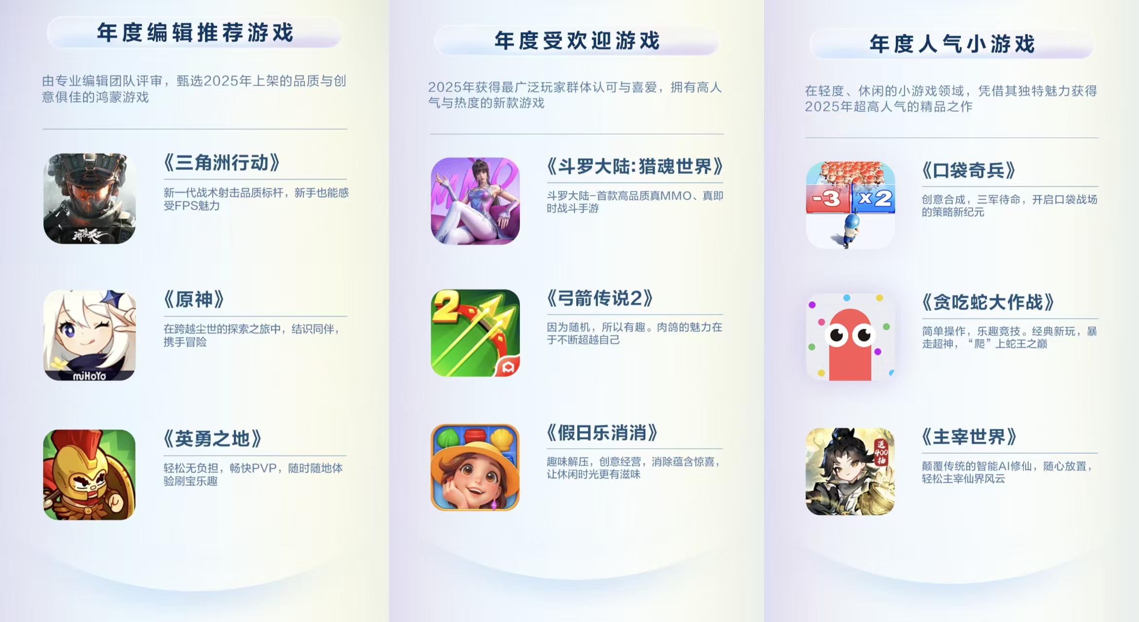 不光是创新赛道有看点,其他榜单也藏着不少玩家们熟悉的身影:专业编辑们盖章认证的 “年度编辑推荐”里,既有《三角洲行动》这种能爽玩搜打撤的战术射击狠活,也有《原神》这种能沉浸式逛开放世界的二游顶流,还有《英勇之地》这种主打轻松无压的休闲 PVP,覆盖了不同玩家的口味;而“年度最受欢迎”榜单就更懂大众了,《斗罗大陆:猎魂世界》《假日乐消消》《弓箭传说2》这些常年霸屏玩家手机的热门款,凭超高人气成功登榜。就连摸鱼党最爱的“年度人气小游戏”前三,也被《口袋奇兵》《贪吃蛇大作战》《主宰世界》承包了,全是通勤、摸鱼时能随手开一把的宝藏!正在使用鸿蒙手机玩游戏的小伙伴们,快看看你们玩过的游戏有没有在榜单上?