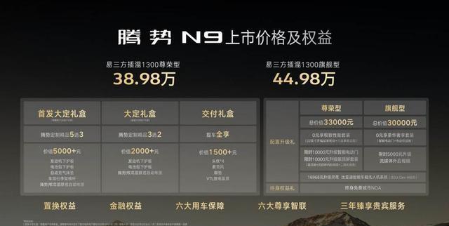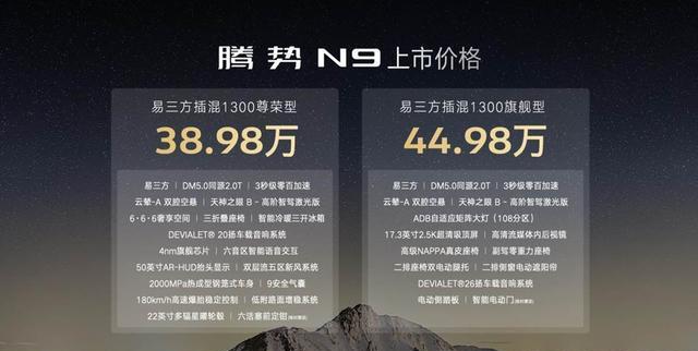 腾势N9在3月21日震撼上市,它可是带着满满的诚意和强大的实力来的。这款车推出了易三方插混1300尊荣型和易三方插混1300旗舰型,官方指导价在38.98万元 - 44.98万元之间。
