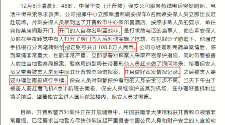 12 月 10 日凌晨,参与救援的安保公司公开了细节:当天早上五点接到报警,赶到酒店时开门的人正是蓝战非,他描述的遭遇和蓝战非长文里的内容完全吻合。安保公司还证实,绑匪当时胁迫蓝战非通过手机银行分两笔转了 108.8 万人民币到指定账户,当地警方得知涉案金额后高度重视,立刻安排安保人员 24 小时贴身保护蓝战非。安保公司的公开佐证,彻底击碎了 “编造剧情” 的质疑,也让网友看清了绑架的真实性。