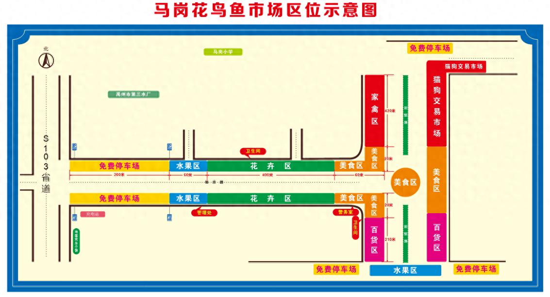 从“狗市”西入口走进,右侧醒目的“马岗花鸟鱼市场区位示意图”映入眼帘,市场被清晰地划分为免费停车区、水果区、花卉区、美食区、百货区、家禽区、猫狗交易区等七大区域。各功能区标识明确,布局开放通透,既方便人流物流畅通,又保留了传统集市的热闹氛围。向东望去,“免费停车场”的标识格外醒目,车辆整齐停放,有效缓解了赶集群众的停车难题。