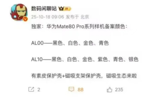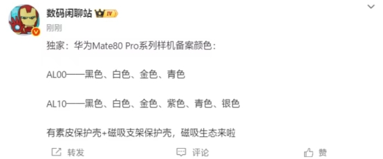 先说说颜色吧,这次Mate 80 Pro系列在配色上可是玩出了花。有消息说,型号AL10的那款,大概率是Mate 80 Pro+或者RS非凡大师版,一口气推出了白色、紫色、金色、青色、银色和黑色,整整六种颜色!这阵仗,摆明了是给选择困难症的人出难题。而标准版的Mate 80 Pro也没落后,白、黑、青、金四色可选,个个都挺有质感。配套的保护壳也很有意思,素皮款和带磁吸支架的款都准备好了,看来华为是铁了心要把颜值和实用一起打包送给用户。