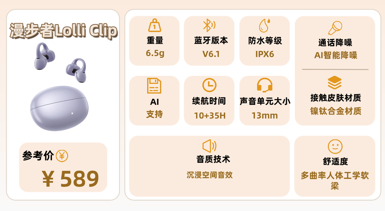 支持蓝牙6.1与LDAC高清音频,连接稳定性好,在适配机型上能提供卓越的无线音质体验,但与非适配设备连接的音质优势会打折扣。其AI通话降噪功能能有效提升通话清晰度。续航表现扎实,单次10小时,综合续航达35小时,并具备IPX6级防水。整体来看,漫步者Lolli Clip是一款在连接技术和中高频音质解析上有突出表现的耳夹式耳机,尤其适合追求高清音频细节、且需要长续航与可靠防护的用户。其在低频表现和音质适配门槛方面的局限,也值得潜在用户注意。