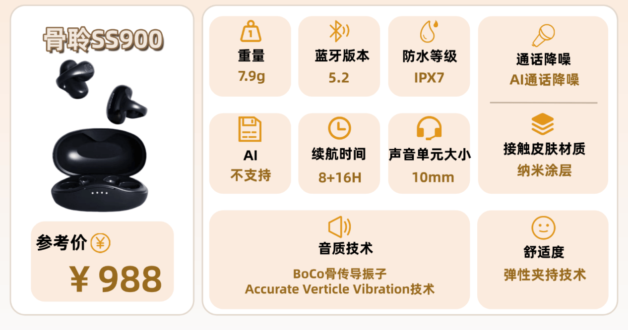 骨聆SS900采用耳夹式设计,通过弹性夹持技术实现稳固佩戴。这种不入耳的佩戴方式解放了耳道,适合长时间使用,并能全程感知周围环境,保障户外安全。作为一款骨传导耳机,骨聆SS900采用了BoCo自研的10mm骨传导振子与Accurate Verticle Vibration技术。它通过骨骼直接传递声音,因此在防漏音方面具有先天结构优势。音质表现上,人声清晰度突出,适合通话和播客类内容,但由于工作原理所限,在极低频和音乐的整体动态范围上与传统气导式耳机存在差异。挂耳耳机哪个牌子好性价比高?盘点2025十大高性价比开放式耳机