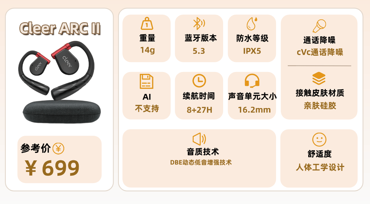 南卡作为开放式耳机领域的佼佼者,综合实力方面也是没得说,是目前开放式耳机里最佳产品之一。OE Mix2在配置方面也是进行了全面升级,采用最新的蓝牙5.4芯片,对比一般的蓝牙芯片,性能方面有质的提升。还拥有双麦ENC通话降噪功能,即便是嘈杂的环境下,依旧能够保持清晰自如的交流。6+18H超长续航,轻松使用一整天,IPX5防水,运动的时候使用也不怕流汗干扰。AI智能功能,让耳机不仅仅能够听歌,更是贴身智能助理。各方面的配置都远超同类竞品,甚至可以媲美千元旗舰款式!