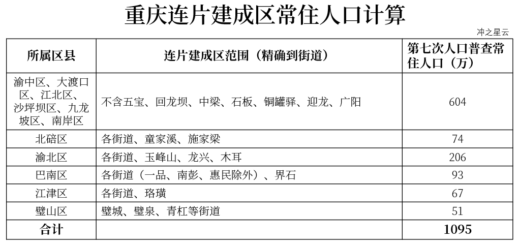 最后,来计算一下除去外围飞地区县,重庆真实的连片建成区人口规模吧!计算结果:重庆本体依旧是一个拥有1000万以上人口的超大城市。