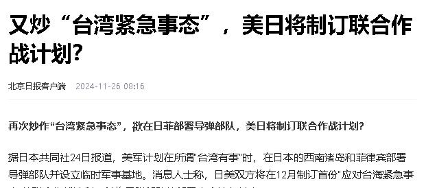 北京日报客户端:又炒“台湾紧急事态”,美日将制订联合作战计划?